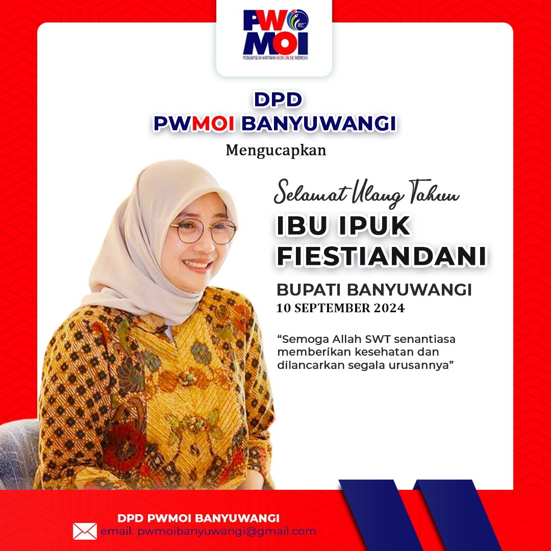 Teruntai harapan dan doa dari masyarakat Banyuwangi yang ditujukan bagi Bupati Banyuwangi Ipuk Festiandani SP.d, yang dikenal sebagai Bupati yang dekat dengan masyarakat.Tidak ketinggalan pula DPD PWMOI Banyuwangi turut bersuka cita untuk Bupati Banyuwangi di hari ini ulang tahun.