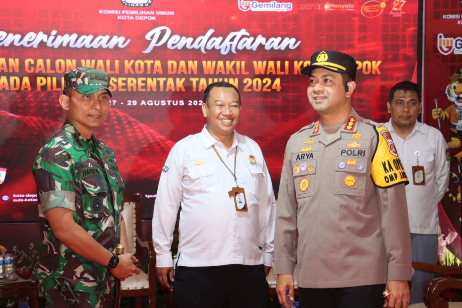DEPOK – Pedulibangsa.co.id – Kapolres Metro Depok, Kombespol Arya Perdana, SH., SIK., MSi., bersama Dandim 0508/Depok Kol Inf Iman Widhiarto, turut serta dalam pengamanan jalannya proses pendaftaran paslon Walikota Depok di Kantor Komisi Pemilihan Umum (KPU) Kota Depok. Kombespol Arya Perdana yang didampingi oleh sejumlah Pejabat Utama Polres Metro Depok, memastikan bahwa pengamanan berjalan lancar dan tertib di lokasi tersebut.