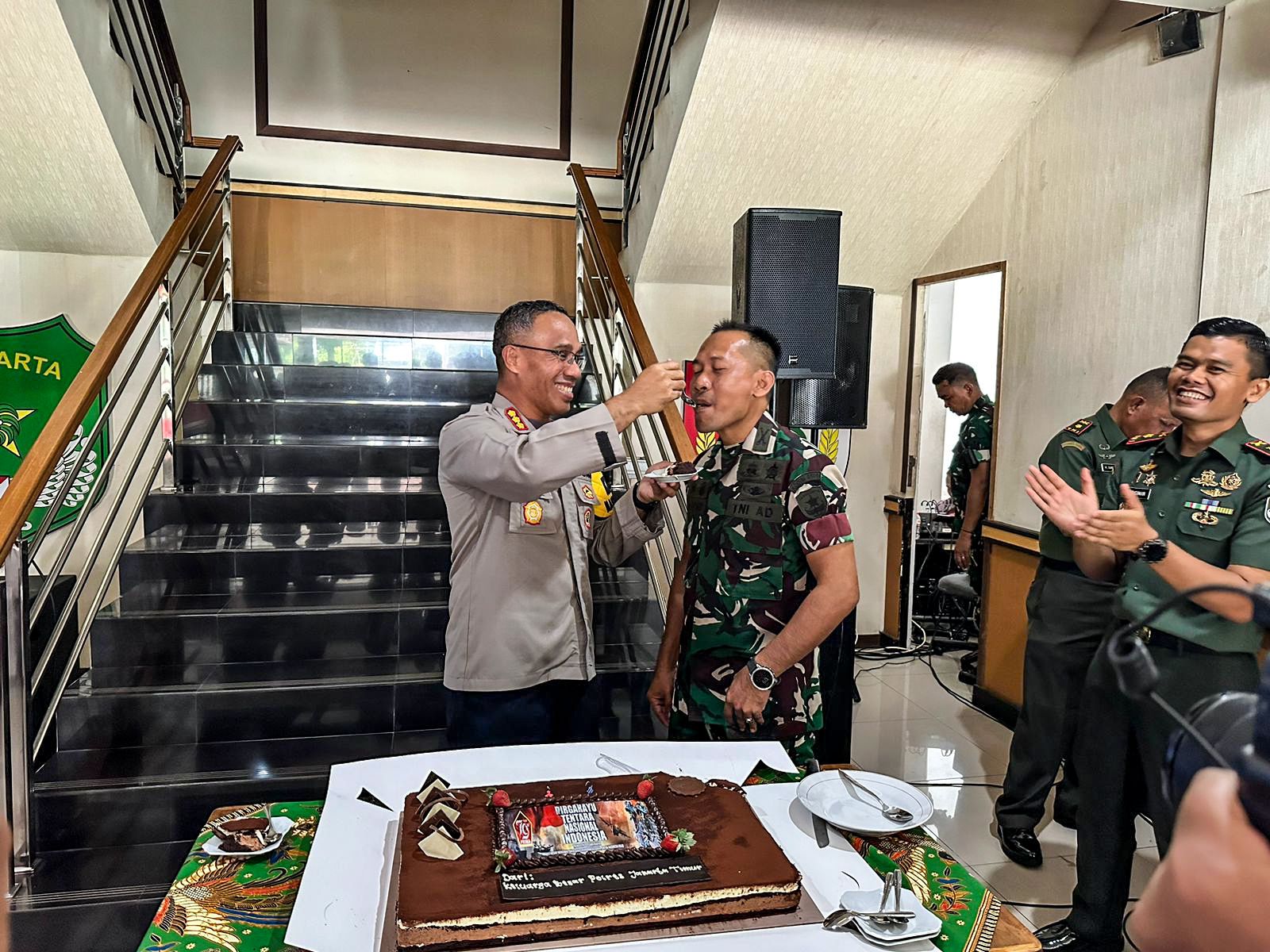 Seperti diketahui sinergitas TNI – Polri di Jakarta Timur sangat solid dan kompak terlihat personel Polres Metro Jakarta Timur memberikan nasi tumpeng, kue ulang tahun dan karangan bunga yang bertuliskan logo Dirgahayu TNI ke 79 “TNI PRIMA”.
