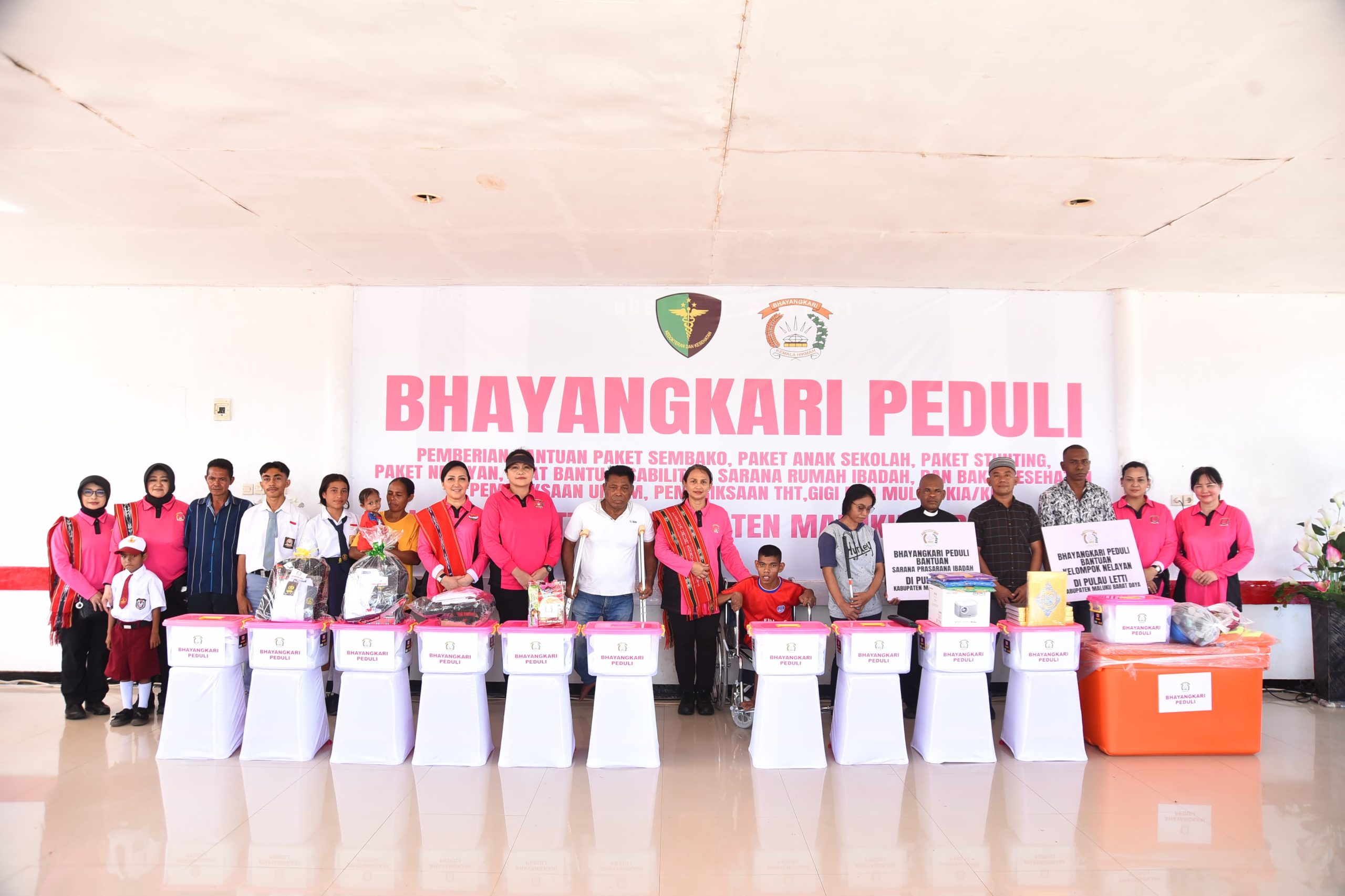 Bantuan sosial yang diserahkan dalam rangkaian kegiatan Bhayangkari Peduli ini berlangsung di lapangan Nuslettu Railetti, Desa Serwaru, Kabupaten MBD.