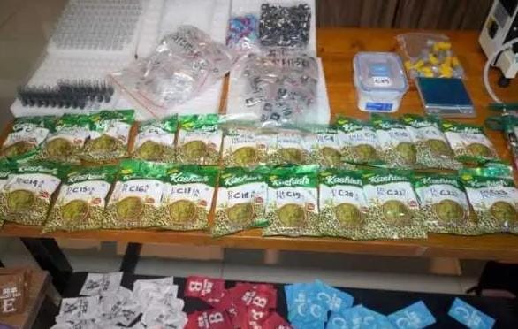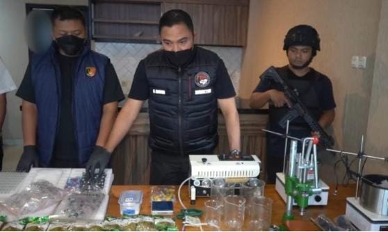 Dari penggeledahan, polisi menyita 30 liter cairan propilen glikol dan serbuk etomidate seberat 2.539,44 gram. Ratusan cartridge siap edar, serta peralatan produksi seperti mesin pres alat suntik cairan, mixer, dan timbangan.