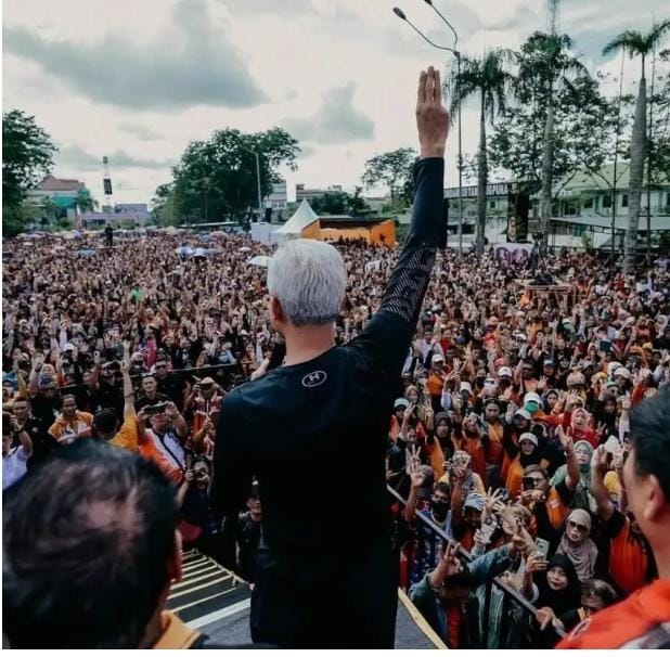 Pada momen tersebut, Ganjar juga melakukan salam tiga jari di tengah kepadatan massa. Jutaan peserta turut mengangkat tangan tiga jari sebagai bentuk simbol dari tiga janji, yakni taat pada Tuhan, patuh pada hukum, dan setia pada rakyat.