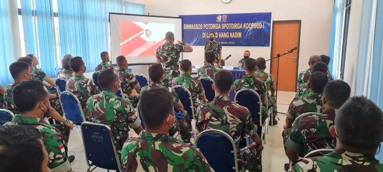 Pada giat Binwassos Potdirga Koopsud I ini diikuti oleh seluruh anggota Lanud Hang Nadim dengan diberikan beberapa materi yang disampaikan oleh tim dari Binwassos Potdirga.