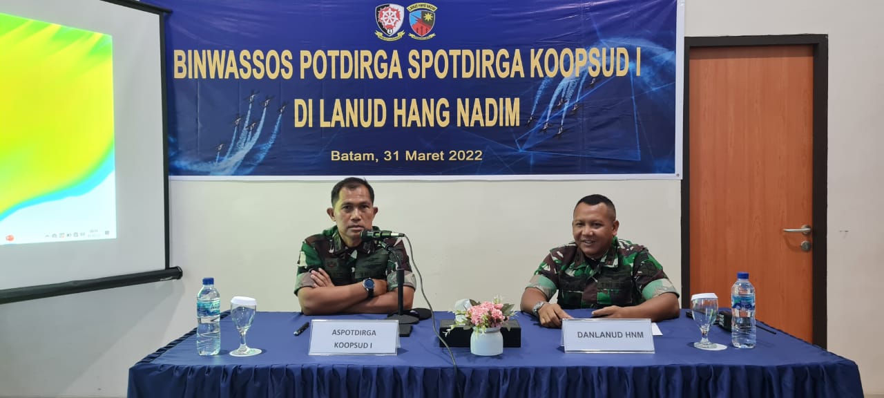 Batam, pedulibangsa.co.id- Aspotdirga Koopsud I Kolonel Pnb Adi Setio Nugroho, S.E., beserta tim melaksanakan Sosialisasi Pembinaan Pengawasan Sosial (Binwassos) Potdirga Koopsud I bertempat di Ruang rapat Lanud Hang Nadim. Kamis, (31/03/2022).
