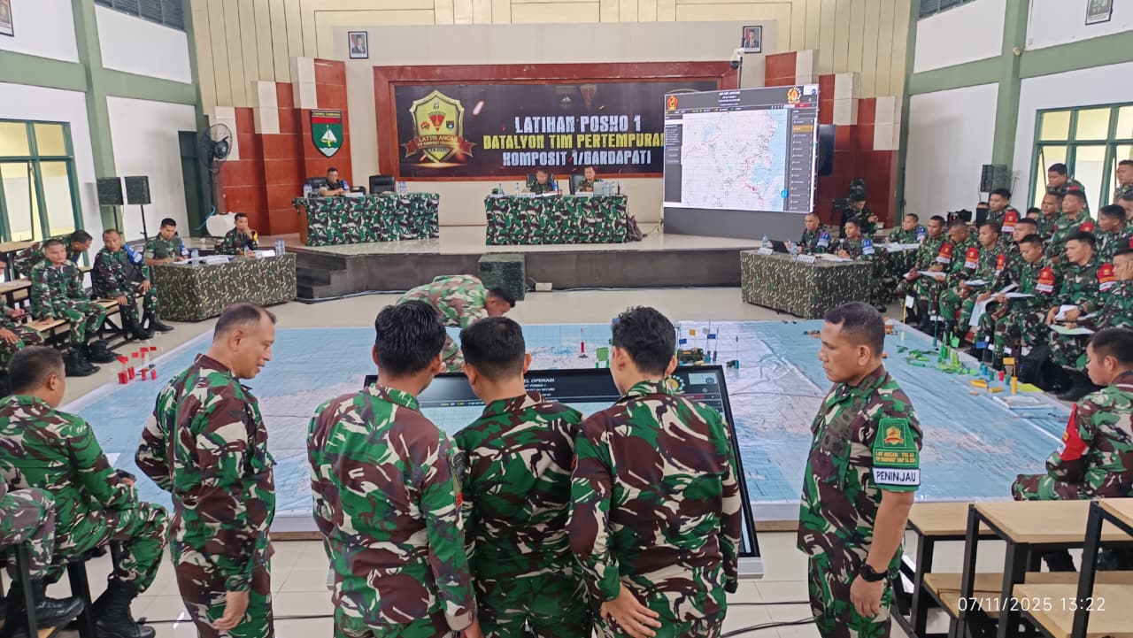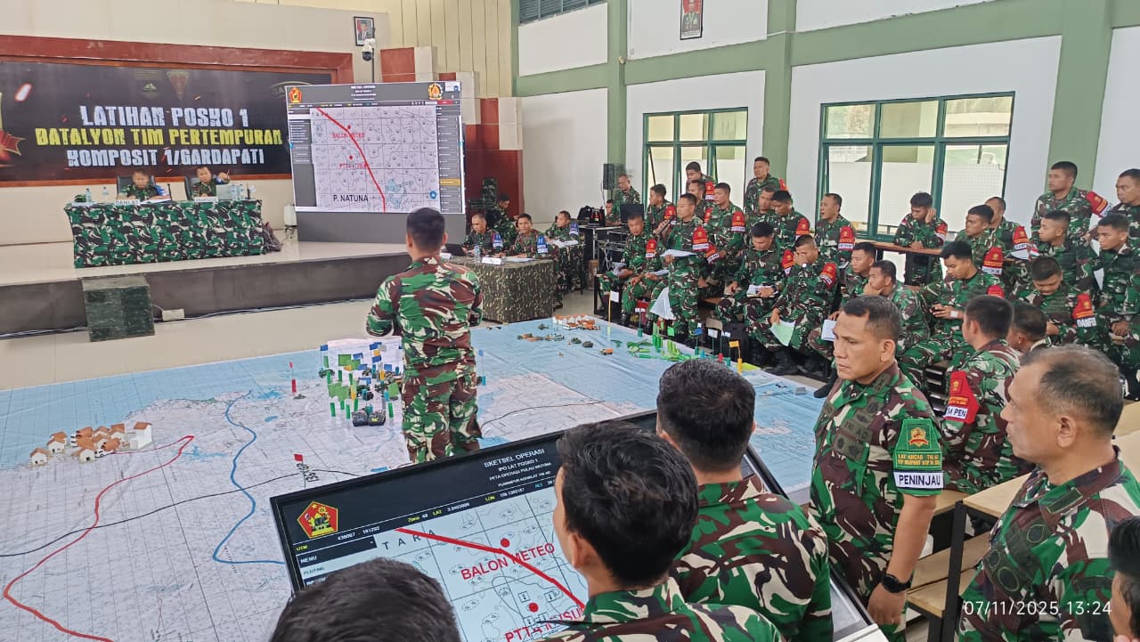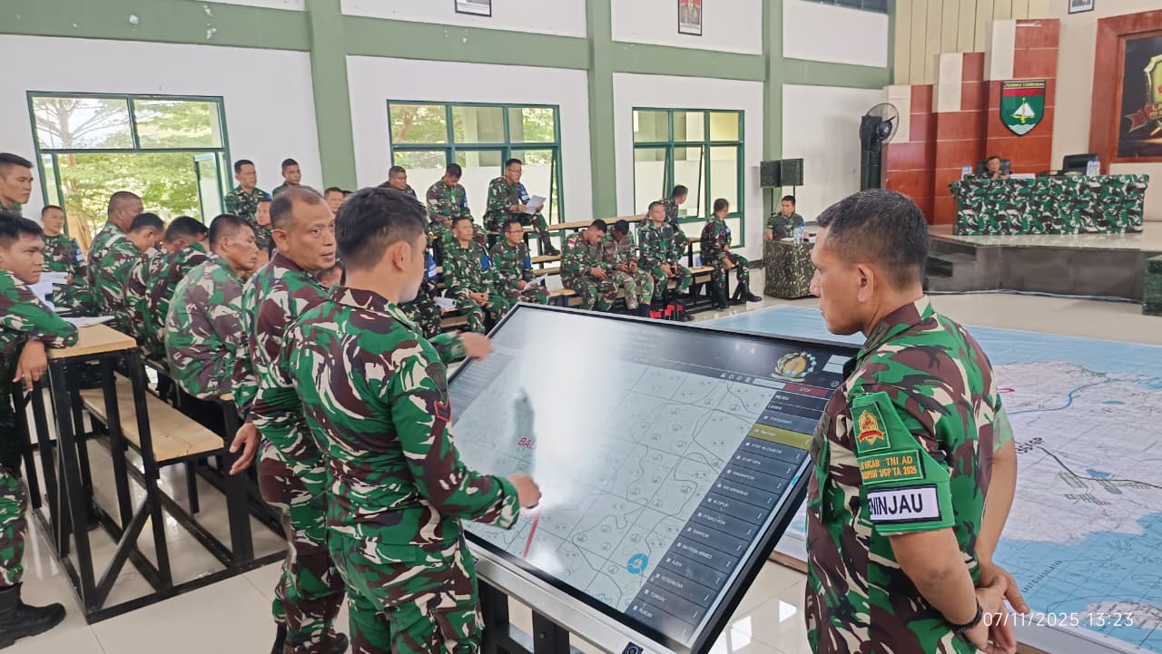Natuna, pedulibangsa.co.id – Pusat Simulasi Tempur (Pussimpur) Kodiklatad mendukung modernisasi latihan TNI AD melalui penerapan Meja Desain Operasi (MDO) pada kegiatan Tactical Floor Game (TFG) sebagai puncak Latihan Posko I (Latposko I) YTP Batalyon Komposit 1/Gardapati Kodam XIX/Tuanku Tambusai, Natuna, Jumat (7/11/2025).