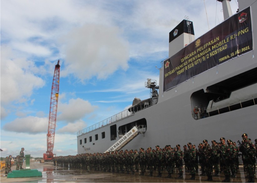 JAKARTA – Pedulibangsa.co.id – Panglima Komando Operasi Gabungan (Pangkoopsgab) Pinang Sirih -03 Brigjen TNI Susilo yang sehari-hari menjabat Asisten Operasi Kaskostrad memimpin upacara pelepasan purna tugas prajurit dibawah komandonya yaitu Satuan Tugas Pengamanan Perbatasan (Satgas Pamtas) Penyangga Mobile RI-PNG Yonif Raider 515 Kostrad yang telah bertugas kurang lebih sembilan bulan, bertempat di Pelabuhan Cargodog PT. Freeport, Kabupaten Mimika. Minggu (11/7/2021).