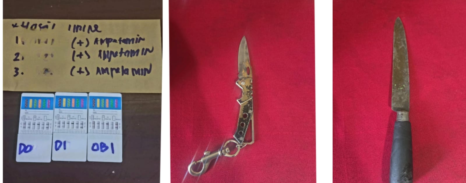 Dari tangan pelaku, polisi juga mengamankan barang bukti berupa senjata tajam. Selain itu, hasil pemeriksaan menunjukkan ketiganya positif menggunakan narkotika jenis methamphetamine.