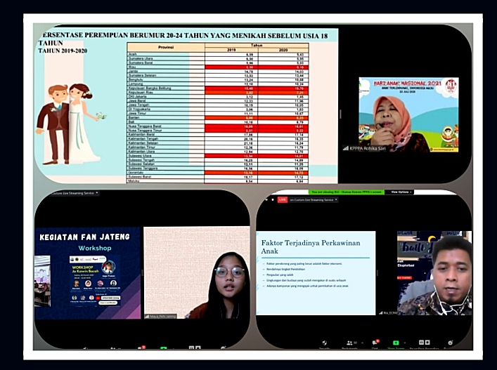 JAKARTA, Pedulibangsa.co.id – Perkawinan anak di Indonesia masih tinggi, berdasarkan Laporan Pencegahan Perkawinan Anak pada 2020, 1 dari 9 anak di Indonesia menikah. Banyak dampak negatif yang disebabkan dari perkawinan anak, diantaranya hilangnya hak anak terhadap pendidikan, tumbuh, dan berkembang.
