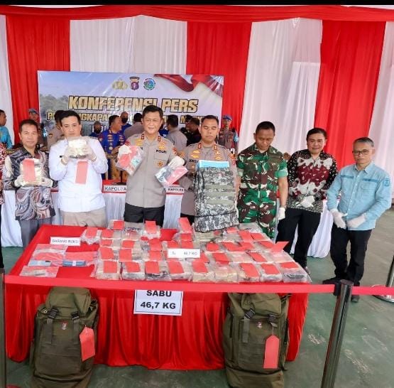 Barang bukti yang diamankan berupa 44 bungkus plastik besar berisi sabu seberat total 46,7 kilogram. Narkotika itu ditemukan dalam tiga tas ransel yang disimpan di mobil Daihatsu Sigra yang digunakan para pelaku. Polisi juga mengamankan empat tersangka berinisial SF, EW, UM, dan MG.