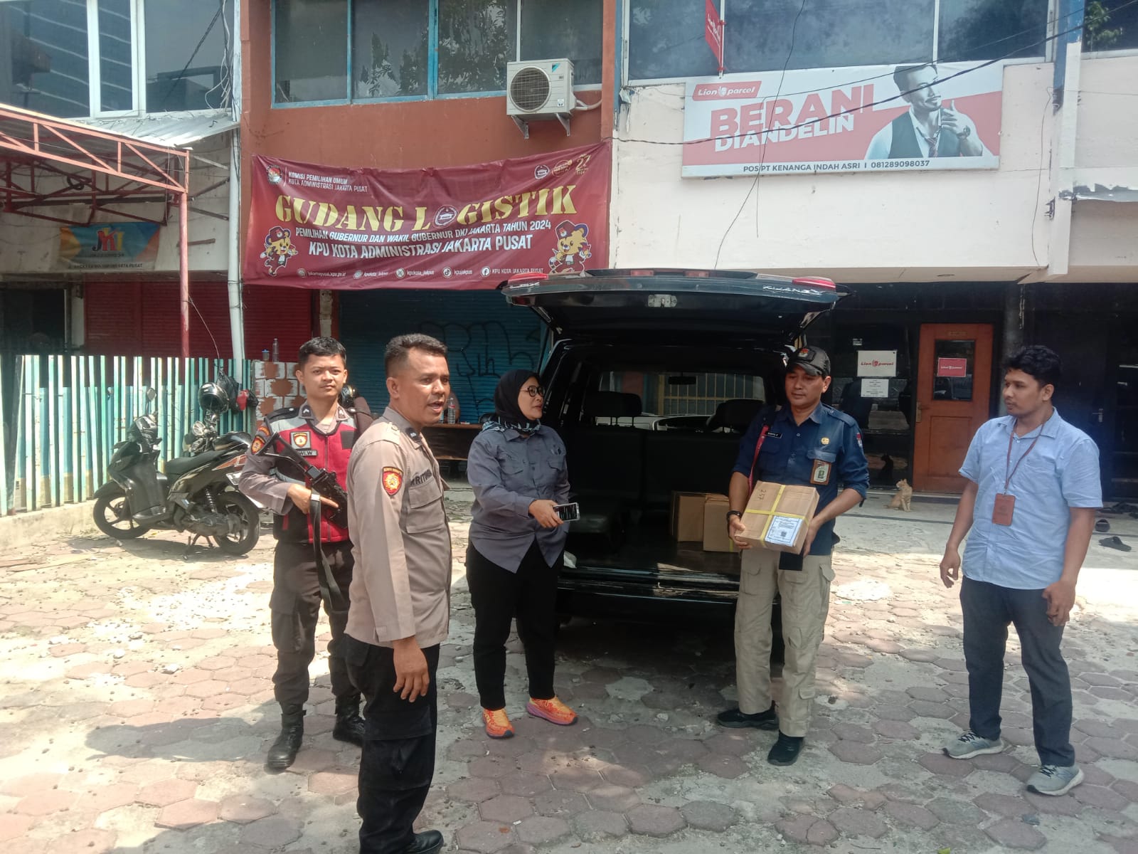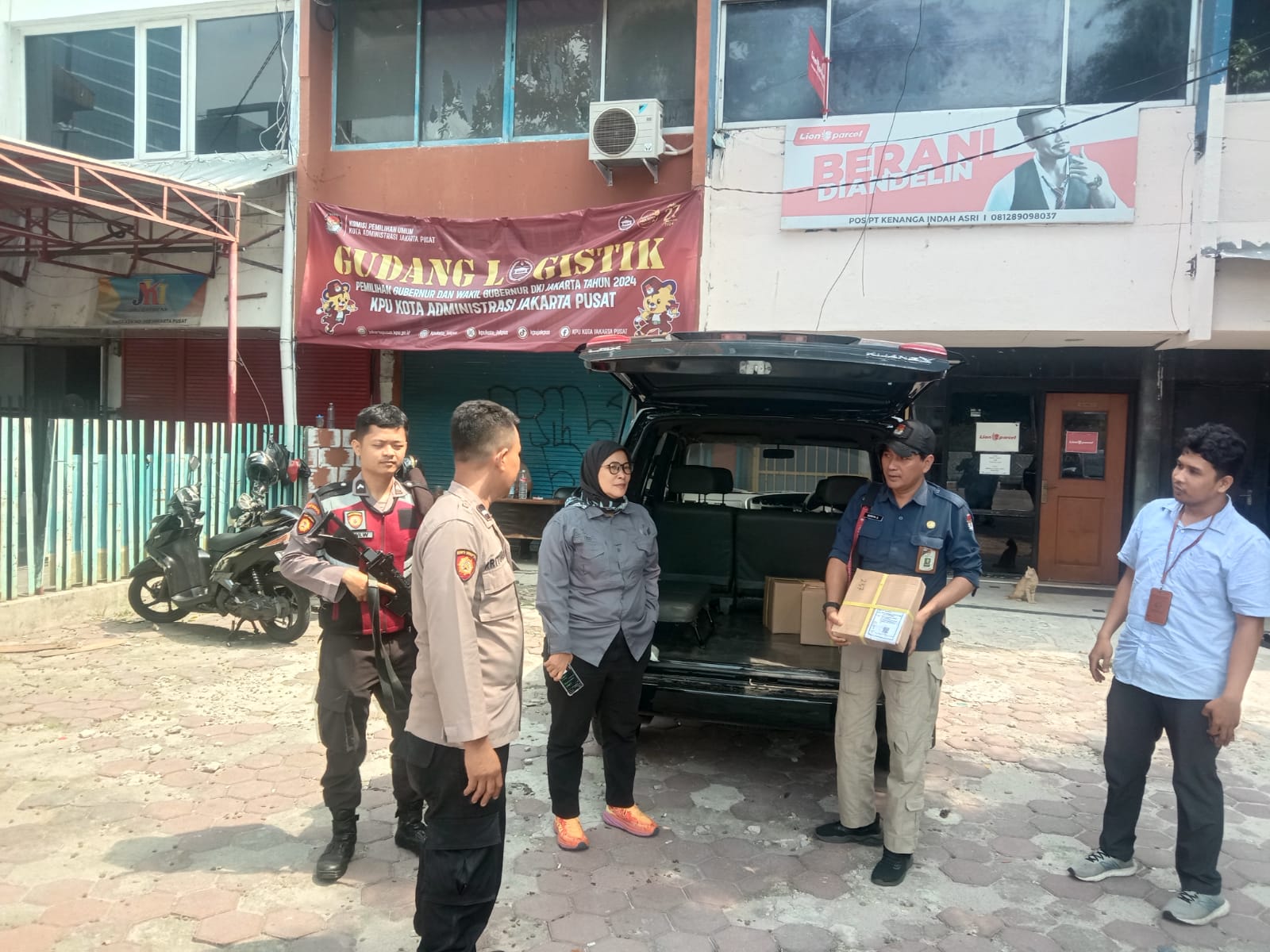 Polri melalui Polsek Kemayoran dan melalui Operasi Mantap Praja 2024 Polda Metro Jaya melakukan pengamanan pendistribusian logistik Pilkada surat suara, Pengamanan dan pengawalan dilakukan di gudang logistik KPU Kota Jakarta Pusat. (Vhee)