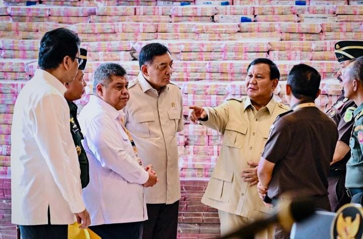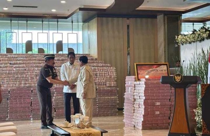 Ketika Prabowo, ST Burhanuddin, dan Purbaya berada di depan tumpukan uang tersebut, terlihat bahwa tinggi tumpukan uang hasil korupsi itu mencapai sekira dua meter. Di salah satu bagian tumpukan uang tersebut juga ada tulisan nominal uang yang mencapai Rp 13.255.244.538.149 atau Rp 13 triliun.