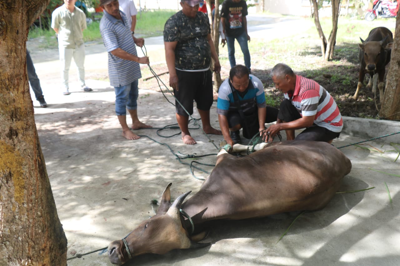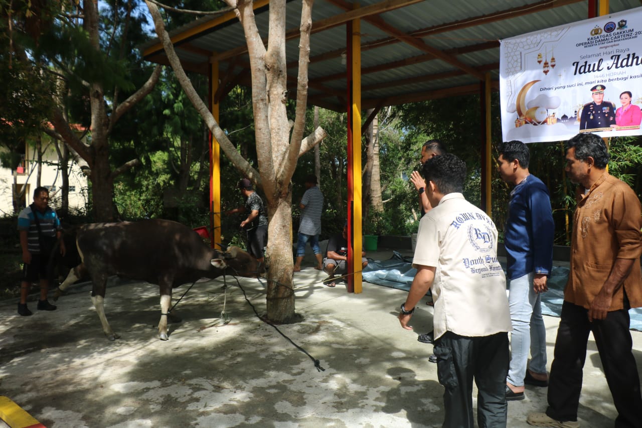 Sebanyak dua ekor sapi disembelih dalam kegiatan yang dipimpin oleh Kompol Suheriadi, S.H., S.I.K., M.M. selaku Kasubsatgas Investigasi Satgas Gakkum Ops Damai Cartenz, serta Kompol Aries Diego Kakori, S.I.K. selaku Perwira Minops Satgas Gakkum Ops Damai Cartenz.