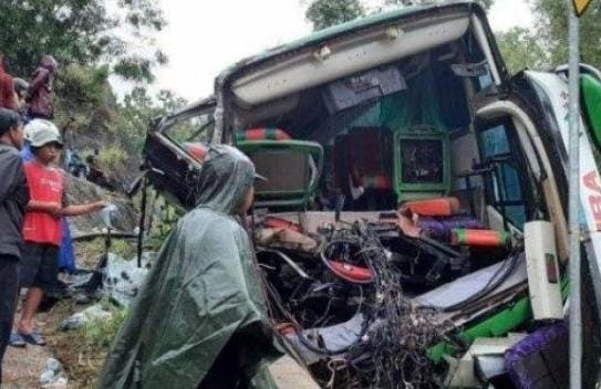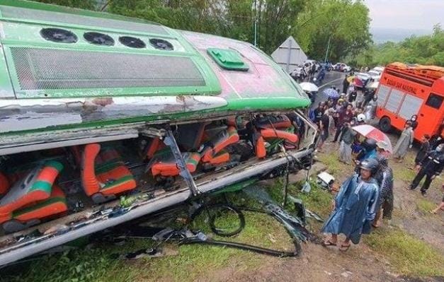 Satu unit bus pariwisata menghantam tebing Bukit Bego, Padukuhan Kedungbueng, Kelurahan Wukirsari, Kapanewon Imogiri, sekitar pukul 14.00 WIB.