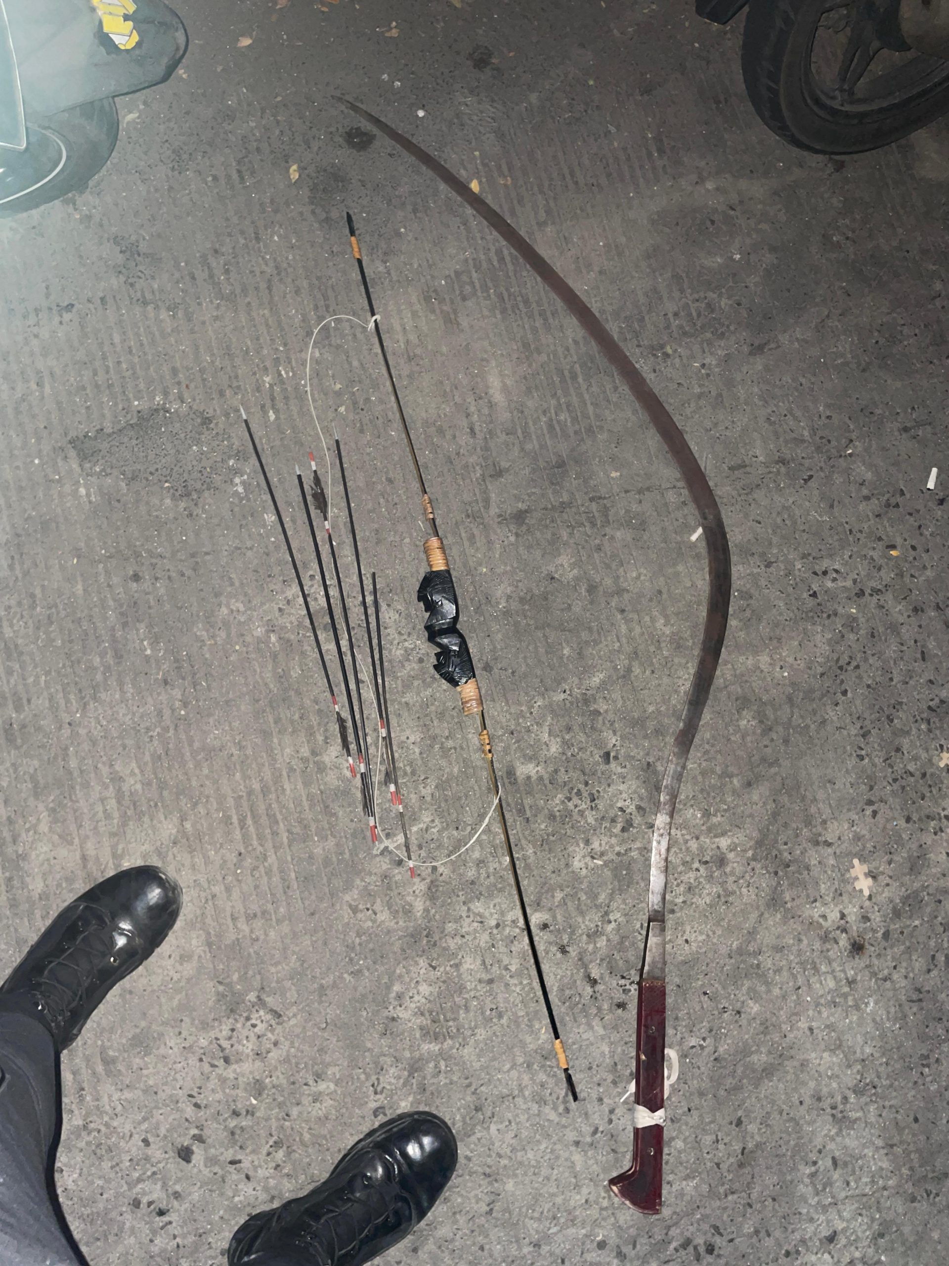 Dari hasil pemeriksaan di lokasi, petugas menemukan barang bukti berupa satu buah celurit berukuran besar, satu buah busur panah, serta lima anak panah yang diduga akan digunakan dalam tawuran.