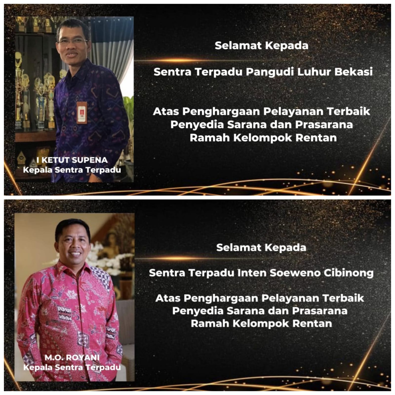 Dua UPT Kemensos yang memperoleh penghargaan yaitu Sentra Terpadu Pangudi Luhur Bekasi yang dipimpin oleh I Ketut Supena dan Sentra Terpadu Inten Soeweno Cibinong, Bogor yang dipimpin oleh MO. Royani.
